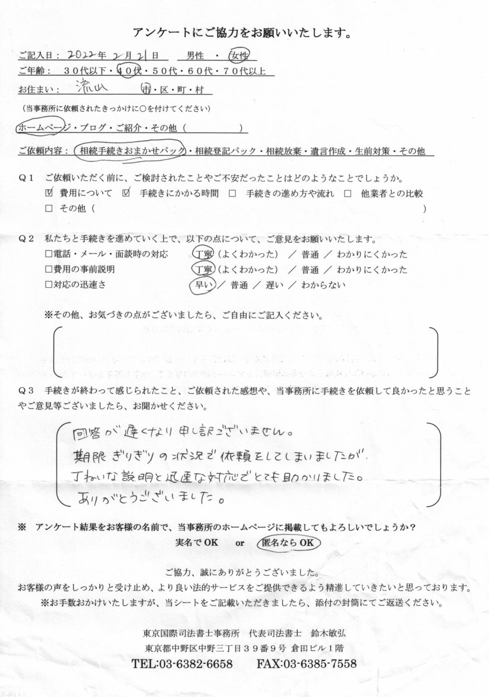 期限ぎりぎりの状況で依頼をしてしまいましたが、丁寧な説明と迅速な対応でとても助かりました。ありがとうございました。