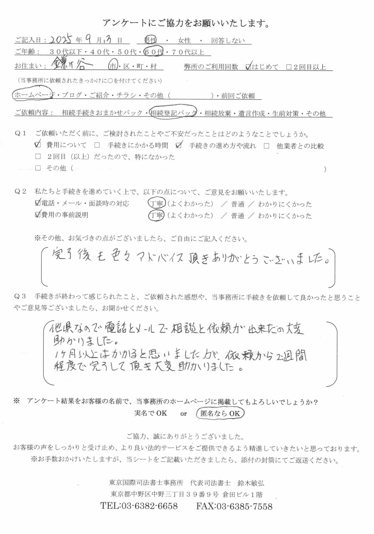 この度は本当にありがとうございました。相続手続きの最初の頃には何もわからず、途方に暮れていましたが、今、ようやく手続きが終了した現在は、少し気持ちも落ち着いたような感じです(ホッとしたような)(でも、まだ、不安な気持ちはあります)