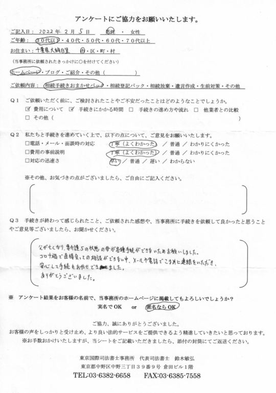 コロナ禍で直接会っての相談ができない中、メールや電話でこまめに連絡をいただき、安心して手続をお任せできました。ありがとうございました。