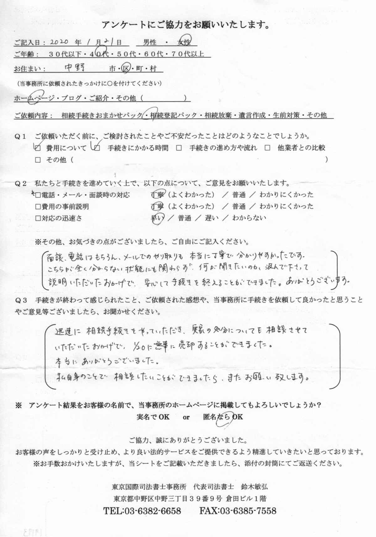 迅速に相続手続きをやっていただき、実家の処分についても相談させていただいたおかげで、1/20に無事に売却することができました。