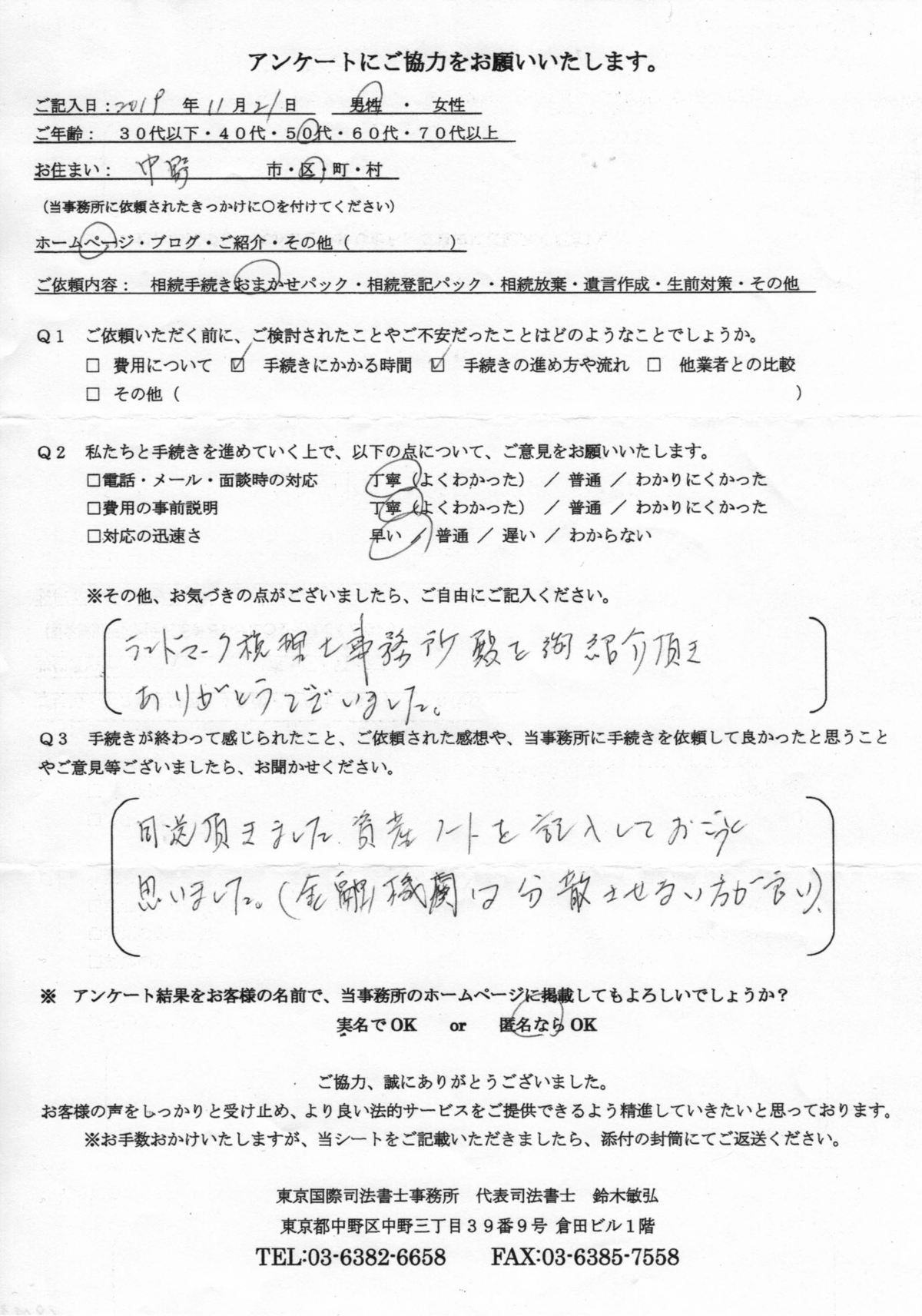 父の相続の際にお世話になり、今回母の相続も依頼させていただきました。手間や時間のかかる手続きはすべてお任せできたので、仕事が多忙でしたが最小限の対応で済み大変助かりました。ありがとうございました。